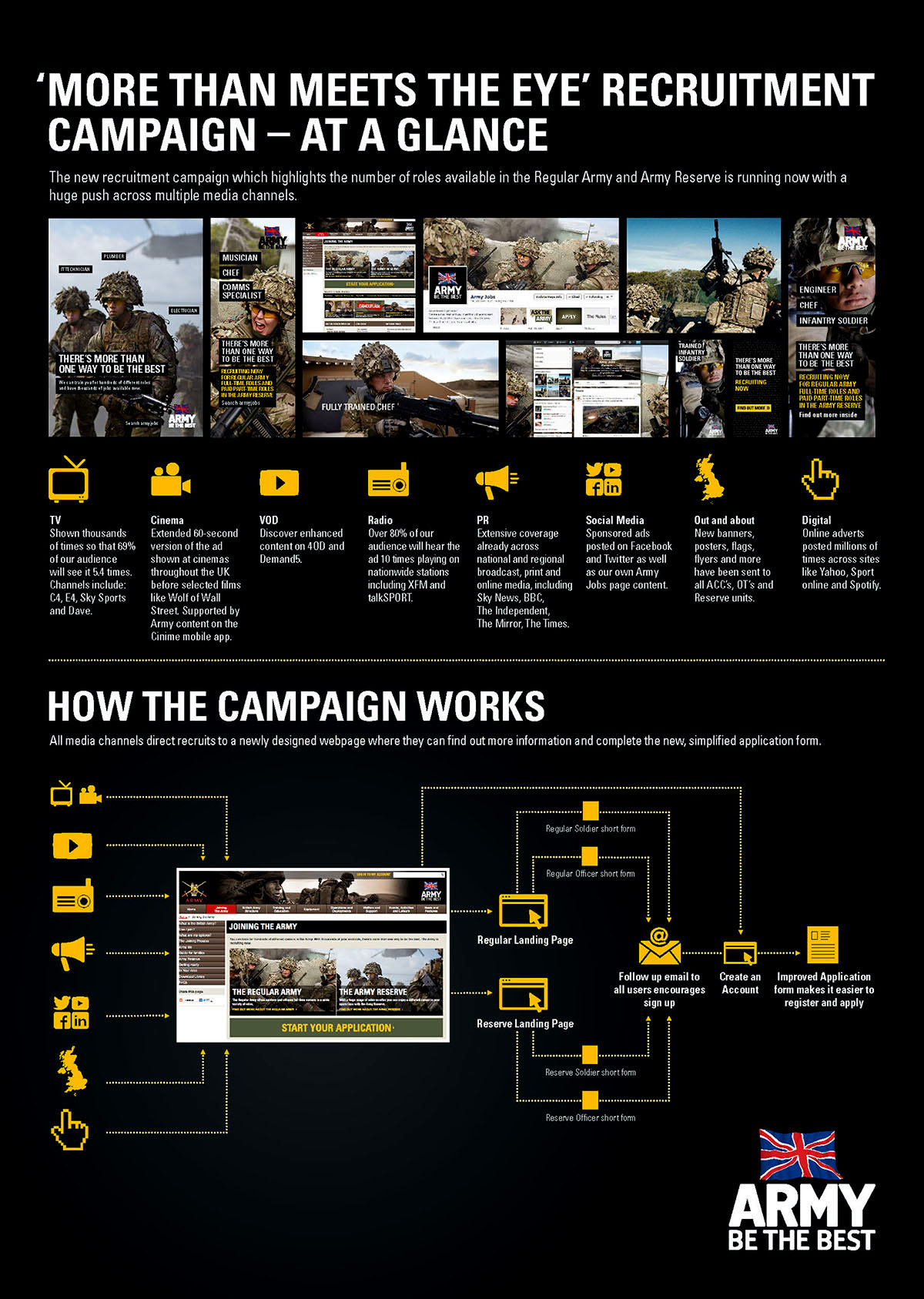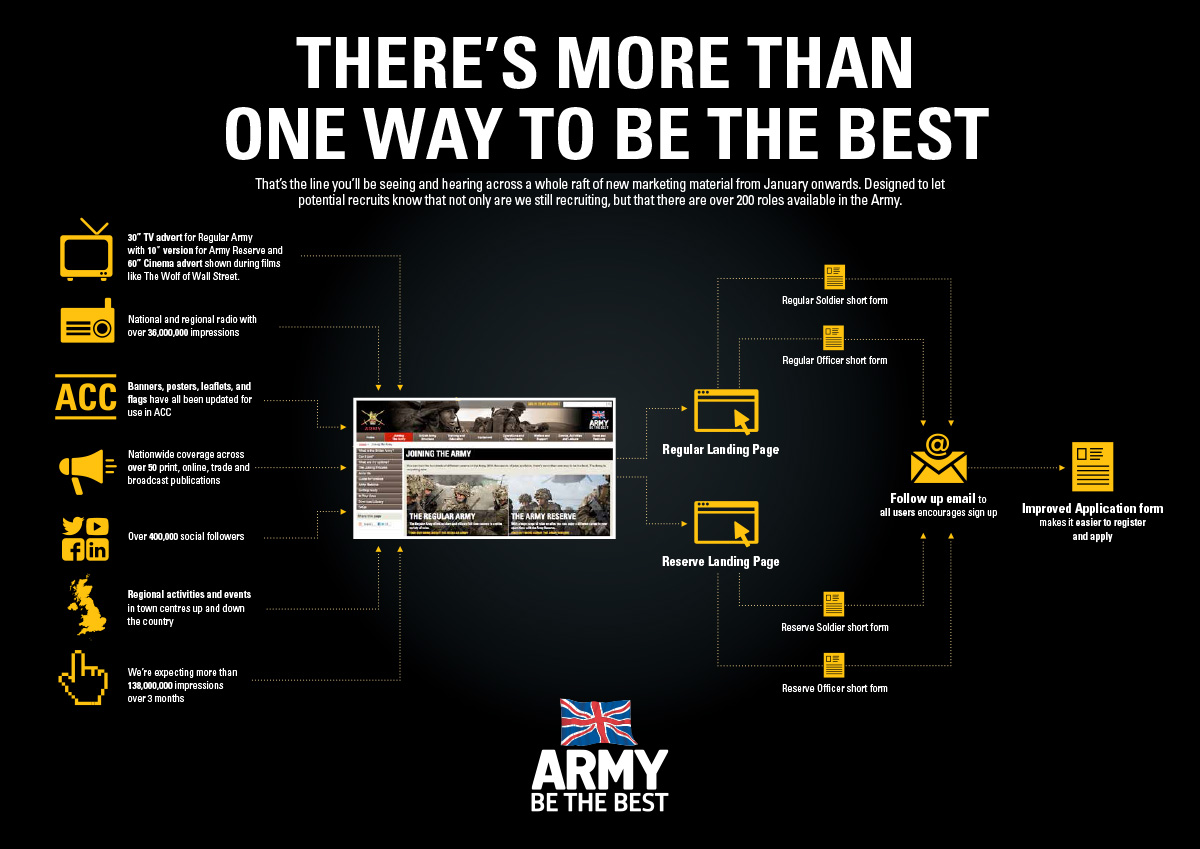 For the launch of their campaign 'MORE THAN MEETS THE EYE' ARMY required a poster highlghting the media channels employed as well as the overall acquisition mechanism. We created a poster that is concise and functional.