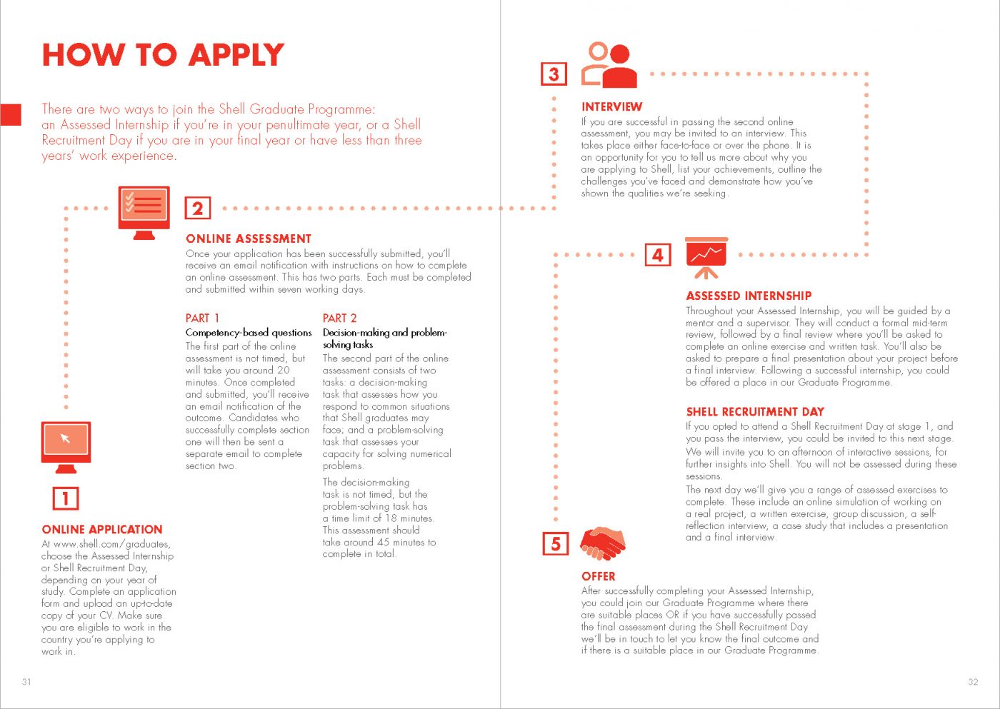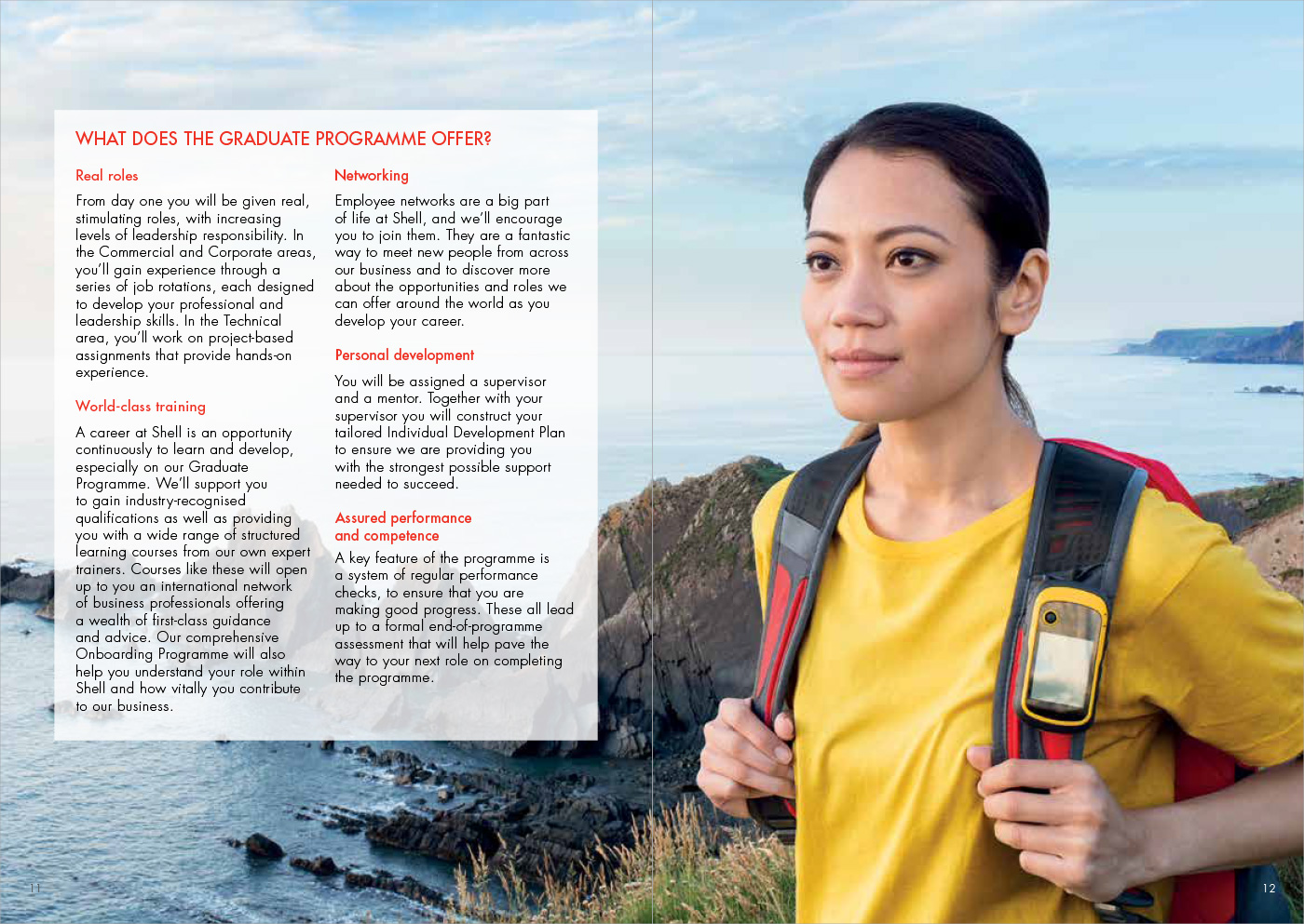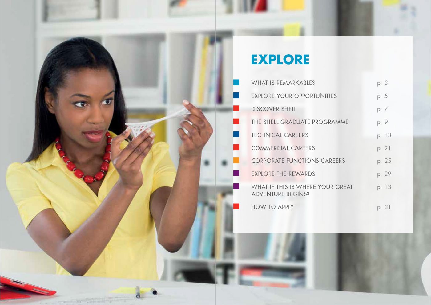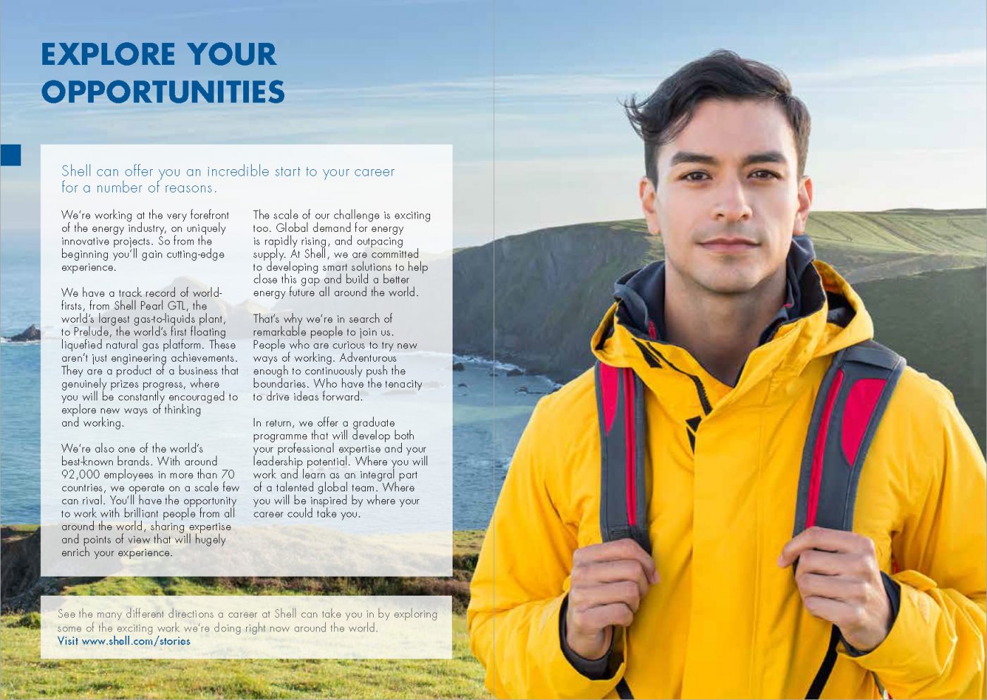 Shell required a brochure aimed at recent and future graduates, informing of the career opportunities and graduate programmes it offers. Serving as an introduction to the company, career types and requirements, the brochure also gives a very clear overview of the online application process.