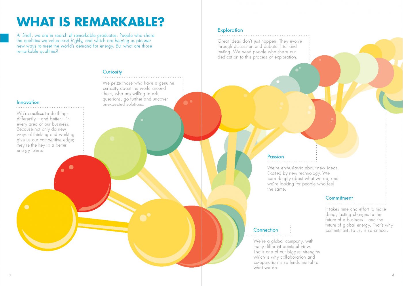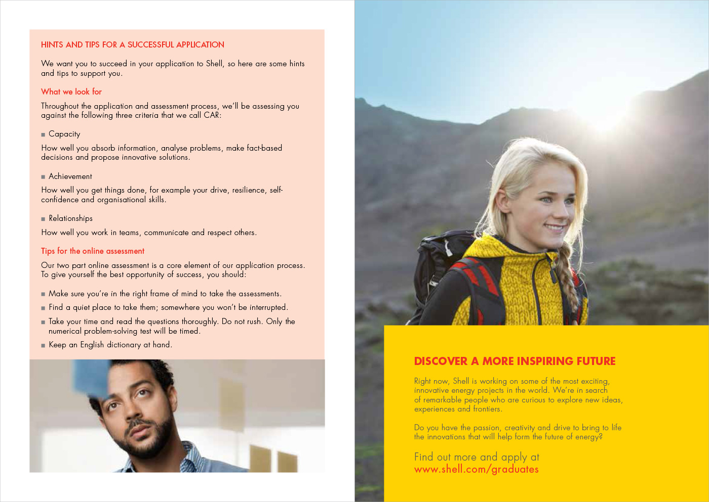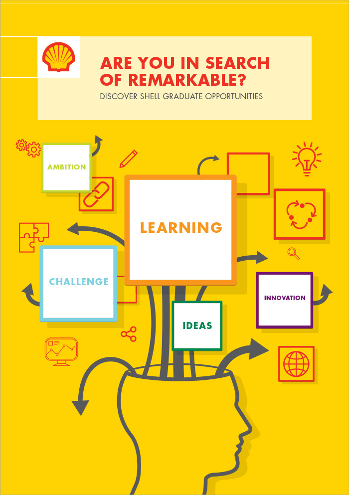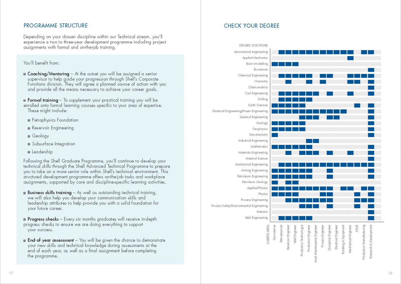 Shell required a brochure aimed at recent and future graduates, informing of the career opportunities and graduate programmes it offers. Serving as an introduction to the company, career types and requirements, the brochure also gives a very clear overview of the online application process.
