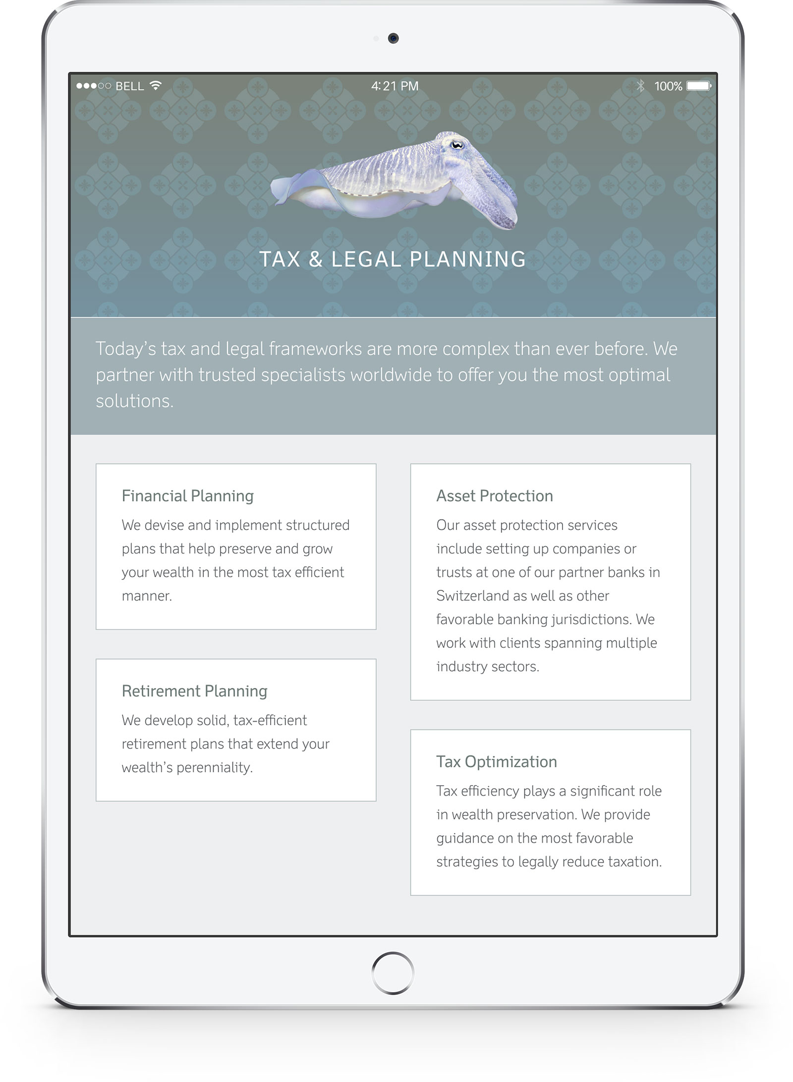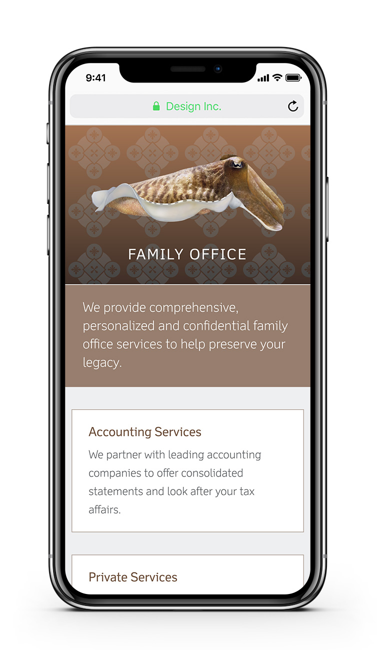 We centered the brand philosophy around the power of adaptability in order to highlight the advantage of having multiple services under one roof. Informing potential clients that wealth management can take on many forms was a theme that was reinforced by using the analogy of adaptation in ocean survival. We established a power animal that could carry this message in a unique and memorable way in order to help differentiate the brand.