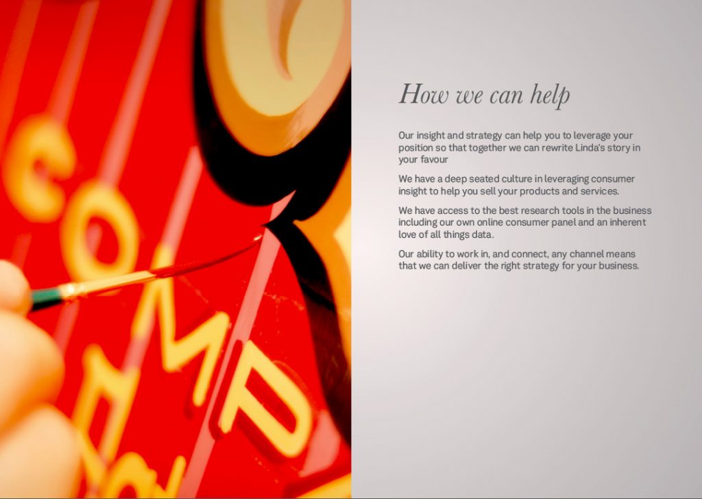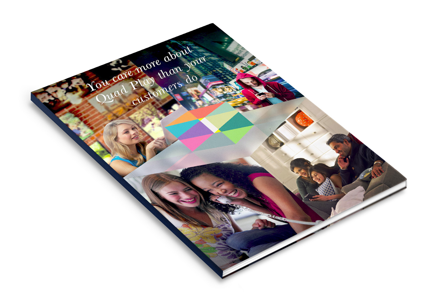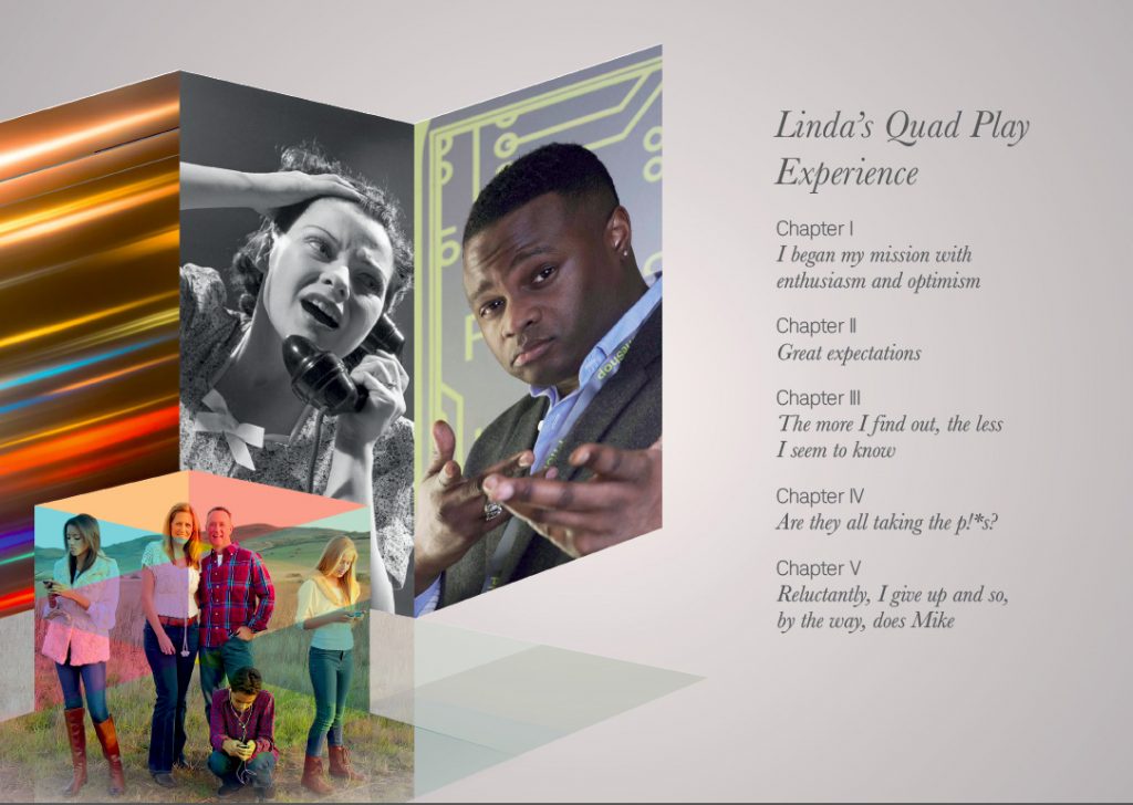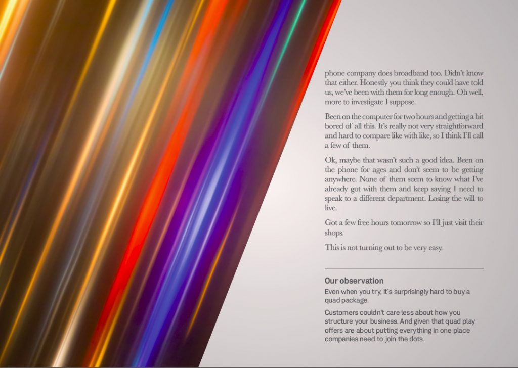 The Quadplay booklet presents an analysis of the implications for telecommunication brands and their quad offering (Broadband, Mobile, Landline, TV). It tells the story and journey of a customer on the lookout for a new package.